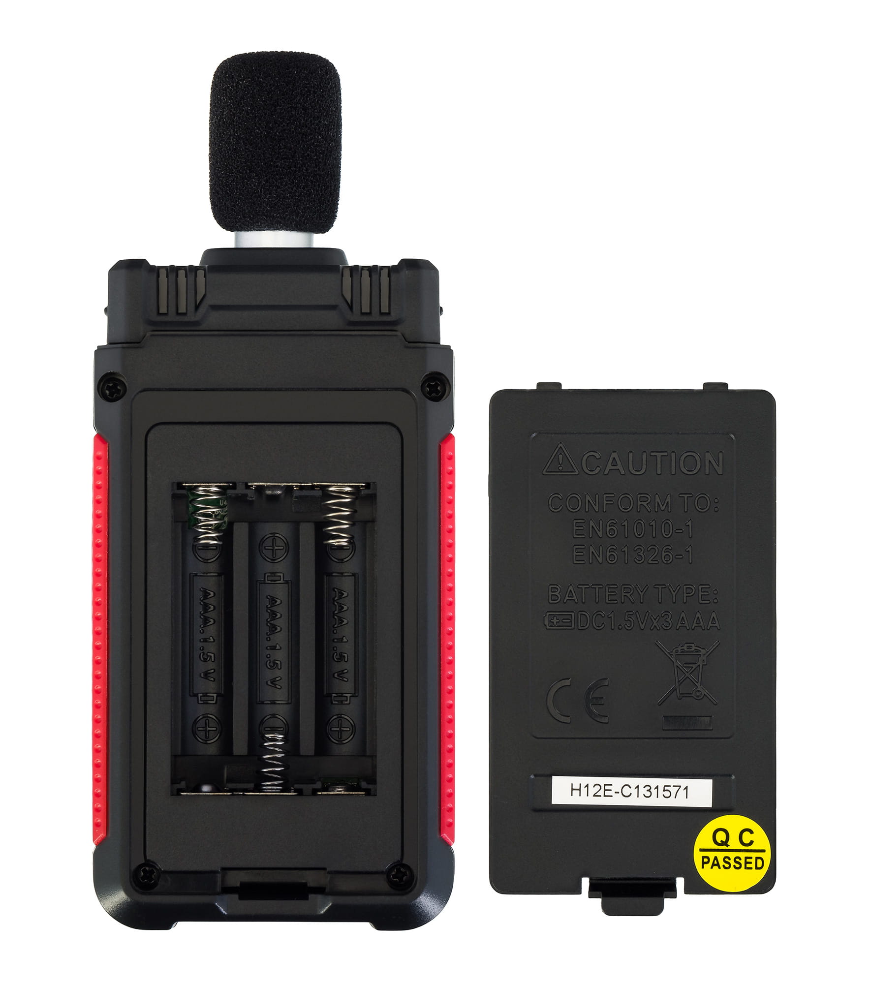 Urządzenie jest zasilane 3 bateriami AAA (sprzedawane osobno). W celu oszczędzania baterii miernik poziomu dźwięku wyłącza się automatycznie po 10 minutach bezczynności. W razie potrzeby można wyłączyć tę opcję. Na ekranie oprócz wyświetlania danych pomiarowych dostępny jest również wskaźnik poziomu naładowania baterii.