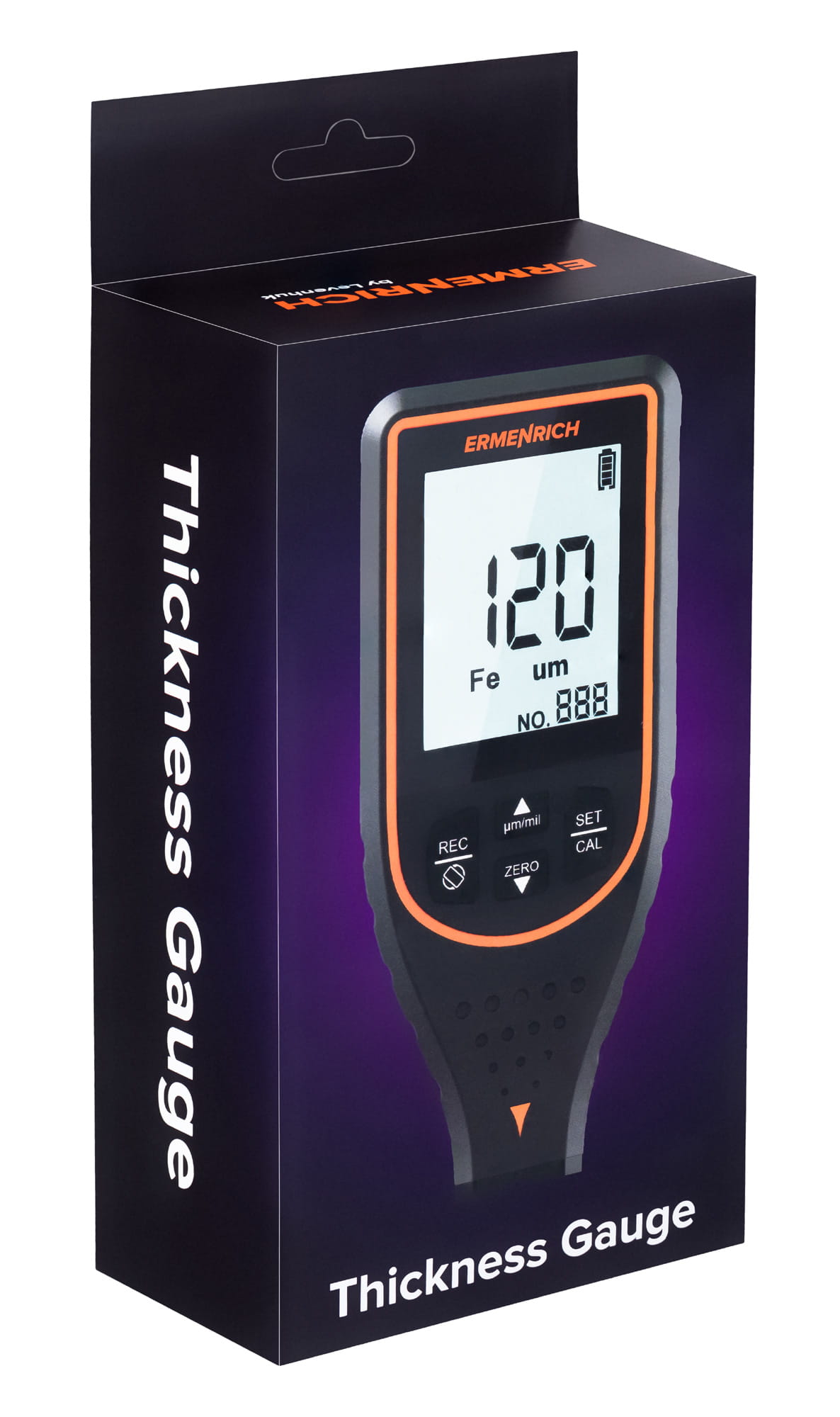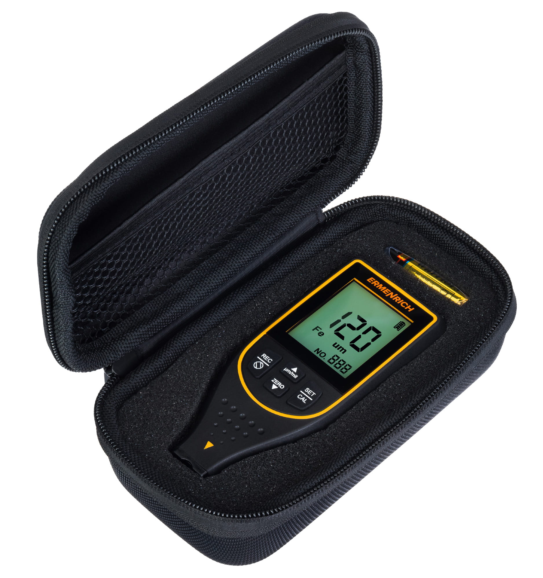 Grubościomierz Ermenrich NT50 to przenośny przyrząd pomiarowy do mierzenia grubości powłok na żelaznych i nieżelaznych powierzchniach metalowych. Może to być farba, lakier, podkład, wypełniacz lub jakikolwiek inny rodzaj powłoki. Proces pomiaru nie powoduje żadnego uszkodzenia powłoki, ponieważ wystarczy jedynie umieścić czujnik na powierzchni.