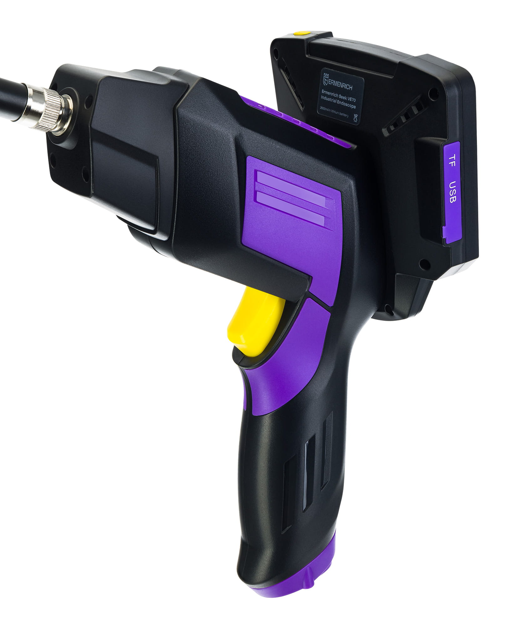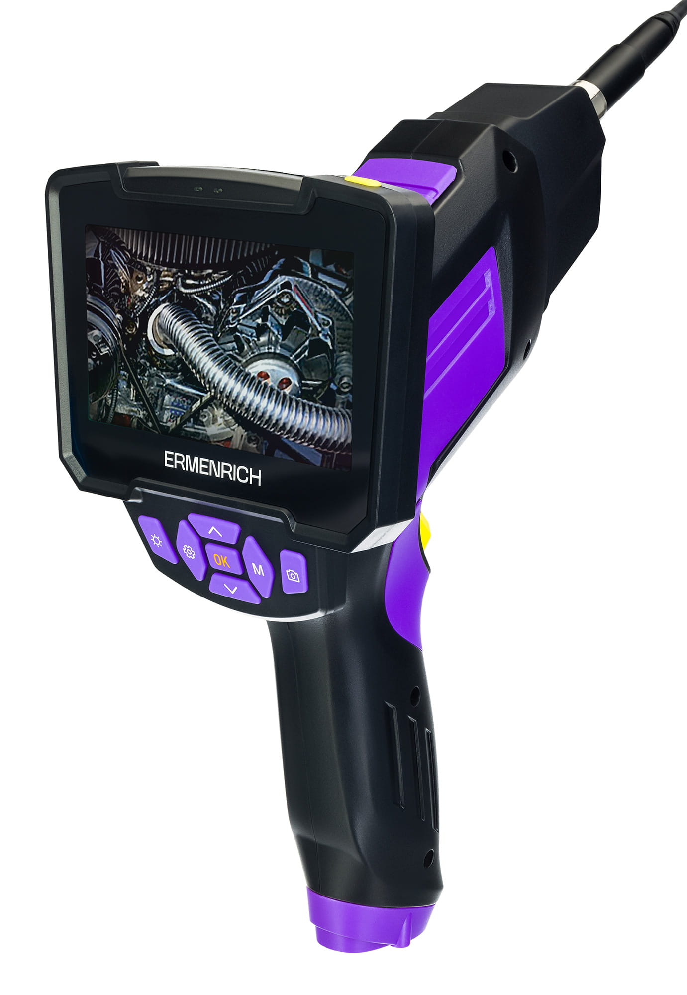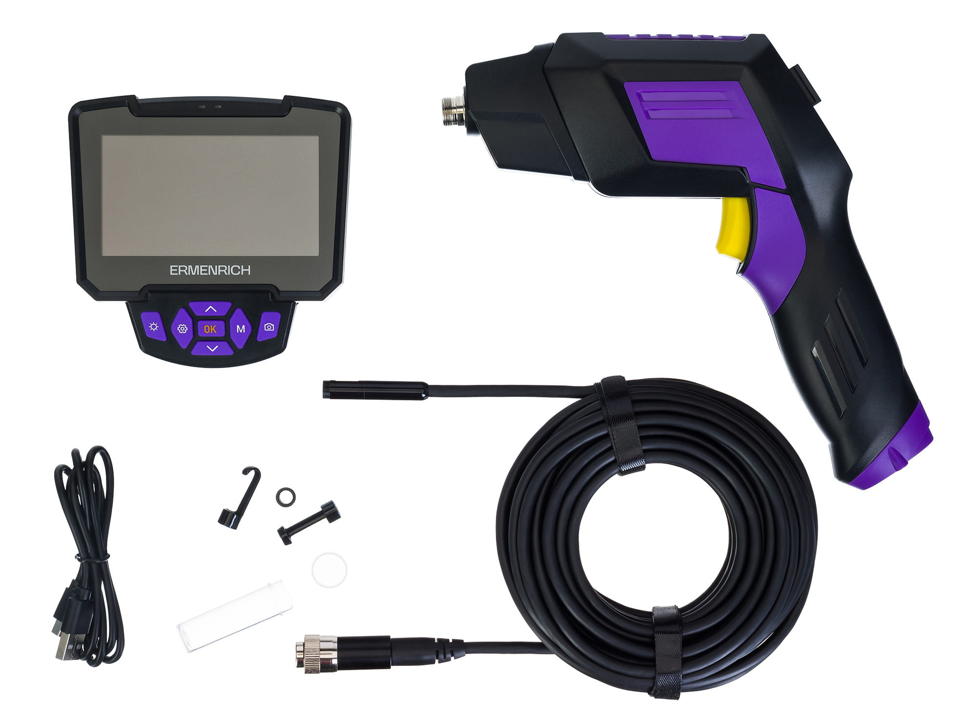Boroskop Ermenrich Seek VE70 jest wyposażony w dwie kamery HD umożliwiające prowadzenie dokładnych inspekcji wąskich i trudno dostępnych miejsc. Kamera jest zamontowana na 10 metrowym elastycznym przewodzie umożliwiający dotarcie do odległych miejsc, a oświetlenie LED ułatwia pracę w warunkach słabego oświetlenia. Kamera inspekcyjna służy do sprawdzania rur kanalizacyjnych, przestrzeni w ścianach, samochodów ciężarowych, urządzeń domowych, silników, turbin itp. Urządzenie jest przydatne zarówno dla majsterkowiczów, jak i profesjonalistów.