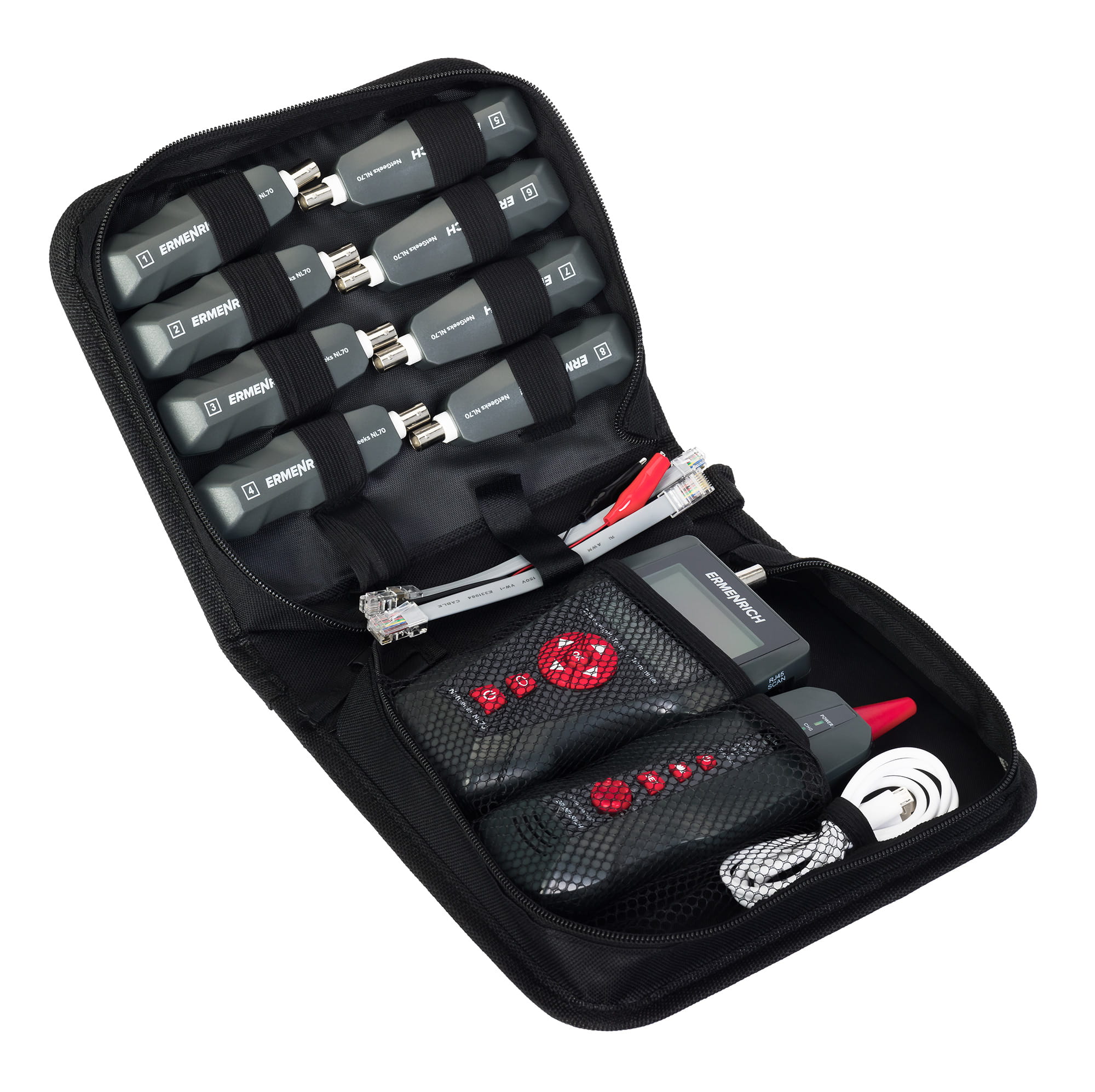 Miernik długości przewodów Ermenrich NetGeeks NL70 to wielofunkcyjny przyrząd pomiarowy do testowania różnych przewodów sieciowych (kategorie 5E/6E), telefonicznych, koncentrycznych i przewodów zwykłych. Urządzenie służy do testowania przewodów o długości do 1000 metrów. Zestaw zawiera 8 jednostek zdalnych, umożliwiając wykonywanie 8 pomiarów w tym samym czasie.
