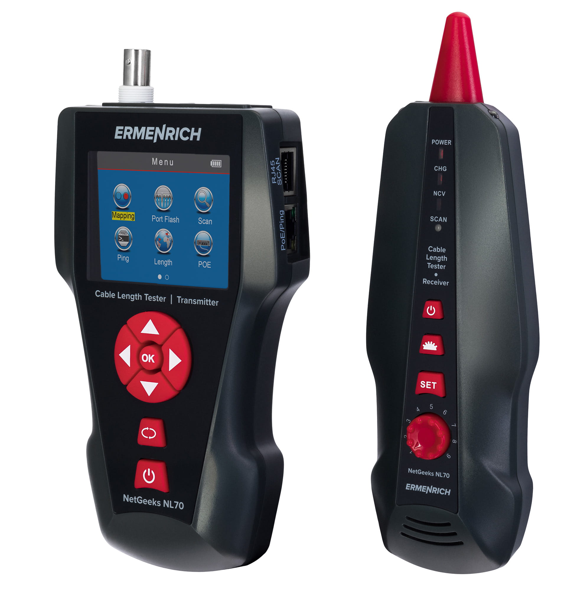 Używając miernika Ermenrich NetGeeks NL70 można testować przewody pod kątem zwarć i przerw w obwodzie, a także skrzyżowanych, odwróconych i rozdzielonych par przewodów. Miernik umożliwia zmierzenie odległości do przerwy w obwodzie. Dostępna jest również funkcja wykrywania przewodów pozwalająca zlokalizować docelowy przewód w całej wiązce. Funkcja zapalenia diody przy gnieździe (Port Flash) służy do lokalizowania konkretnego gniazda na switchu lub routerze sieciowym, do którego jest podłączony przewód. Przy użyciu tego miernika można wykonywać testy PoE i PING oraz zapisywać dane na karcie pamięci.
