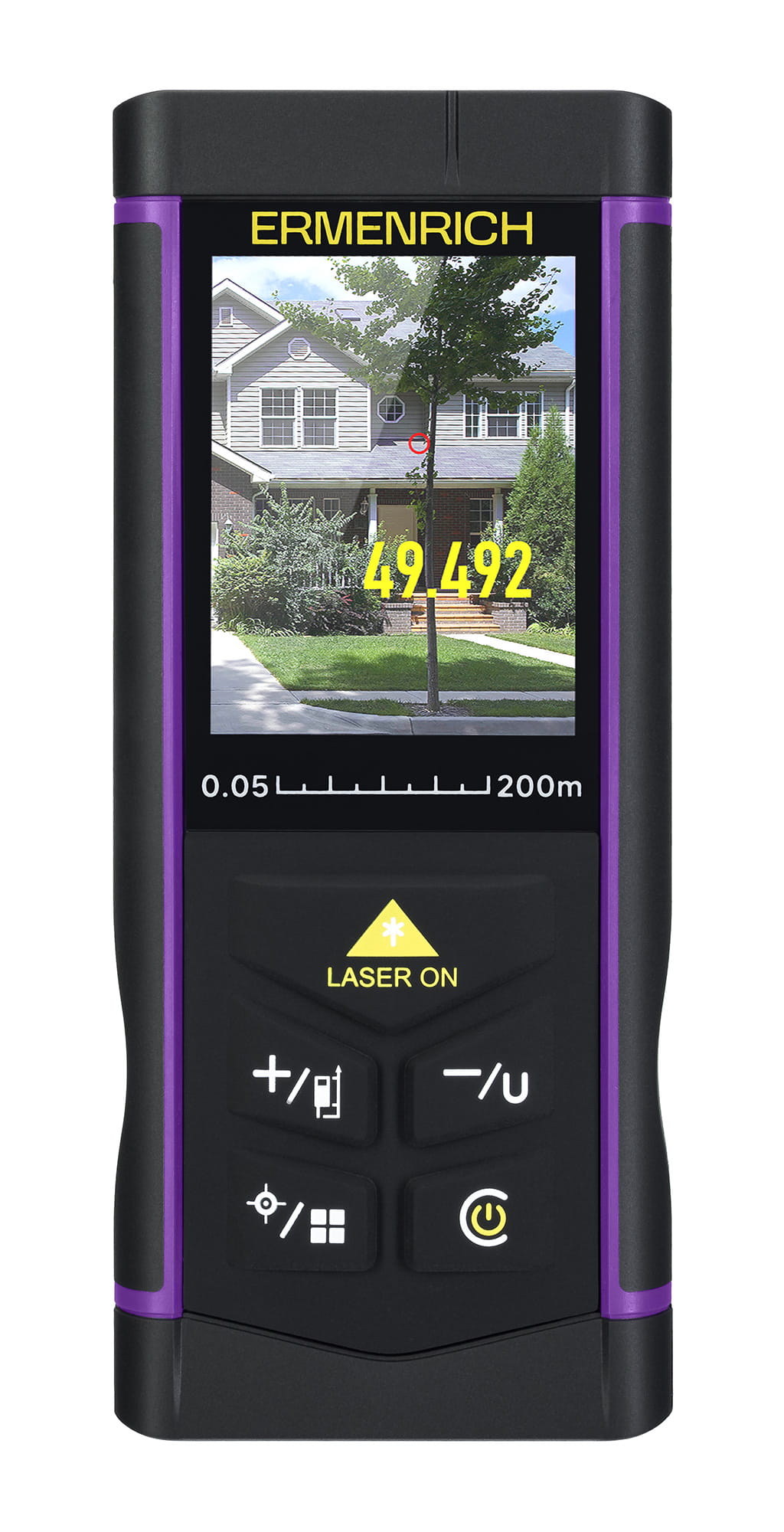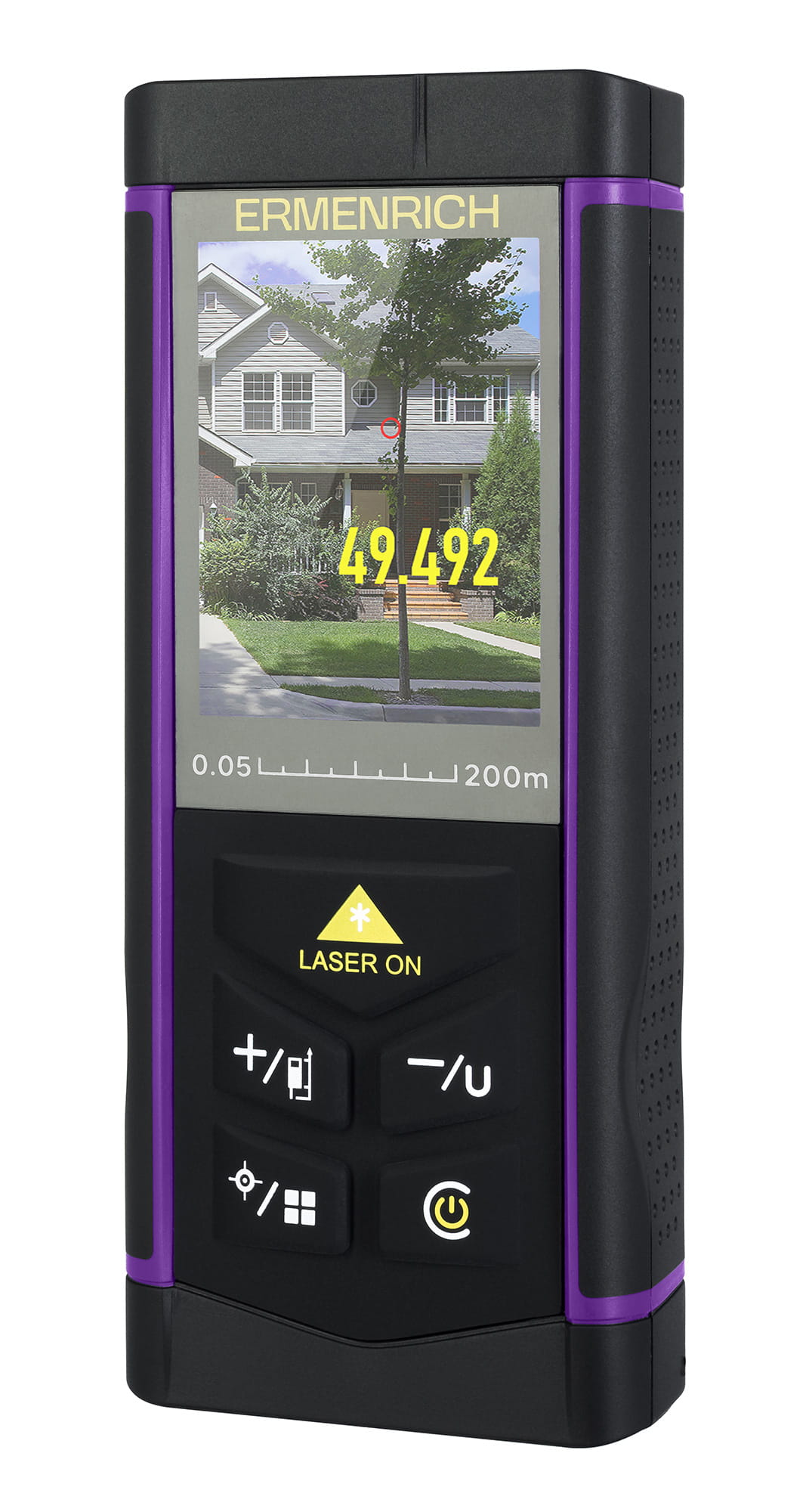 Miernik laserowy Ermenrich PRO LR200 to przenośne urządzenie do pomiaru odległości do 200 metrów. Jest przydatne podczas napraw domowych, obliczania szacunkowych kosztów remontu, dekoracji pomieszczeń, a także podczas budowy domu i pomiarów geodezyjnych lub wykonywania profesjonalnych zadań na placu budowy. Cechą charakterystyczną miernika jest szukacz cyfrowy. Kamera wyświetla na ekranie kolorowy obraz otoczenia. Punkt pomiarowy jest wyraźnie oznaczony jasnym kolorem, a obok niego jest wskazywany wynik pomiaru. Zapewnia to wyraźny obraz punktu docelowego.