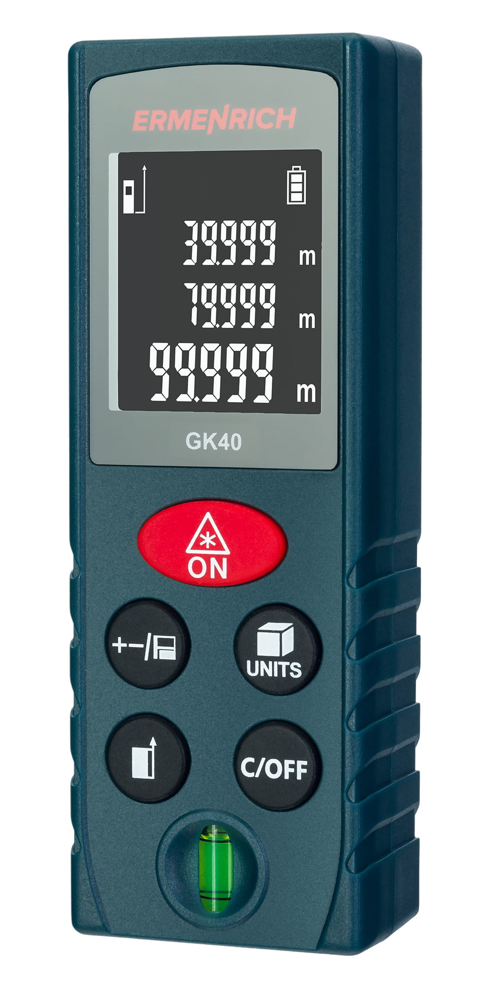 Miernik laserowy Ermenrich Reel PLUS GK40 jest używany do rozwiązywania wielu zadań budowlanych, naprawczych, inżynieryjnych lub domowych. Umożliwia wykonywanie dokładnych pomiarów w zakresie do 40 metrów oraz obliczanie objętości i powierzchni. W przypadku pomiarów w trudnych warunkach, gdy niemożliwe jest prawidłowe ustawienie miernika, dostępna jest funkcja wykorzystująca twierdzenie Pitagorasa, która na podstawie pomiarów pośrednich pozwala obliczyć odległość do żądanego punktu. Urządzenie ma również poziomicę pęcherzykową, która może być używana do precyzyjnej instalacji miernika oraz jako niezależne narzędzie.