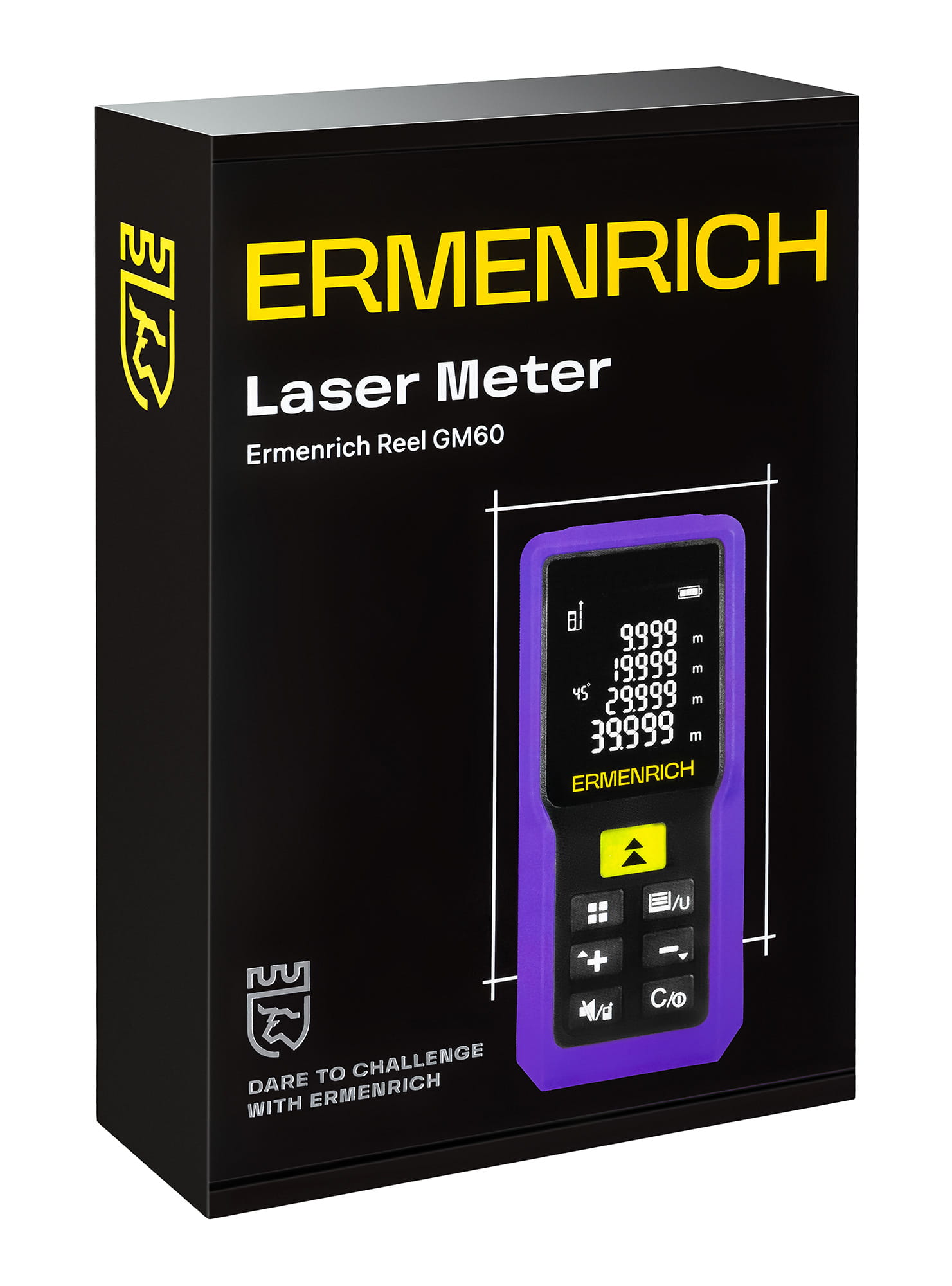 Ermenrich Reel PRO GM60 jest łatwy w obsłudze dzięki niewielkiemu rozmiarowi i dużemu wyświetlaczowi z 4 wierszami. Dostępne są tryby pojedynczego pomiaru odległości i pomiarów ciągłych, a także wybór szeregu różnych jednostek miar. Profesjonaliści docenią jego tryb cichy – umożliwia on pracę w całkowitej ciszy przez wyłączenie alarmów dźwiękowych. Przyrząd jest zasilany 2 standardowymi bateriami AAA, a jeden zestaw baterii starcza na ponad 5000 pomiarów. W celu oszczędzania energii dalmierz jest wyposażony w funkcję automatycznego wyłączania lasera i samego urządzenia. Rejestr historii urządzenia pozwala na przechowywanie dużych ilości danych – 100 grup.
