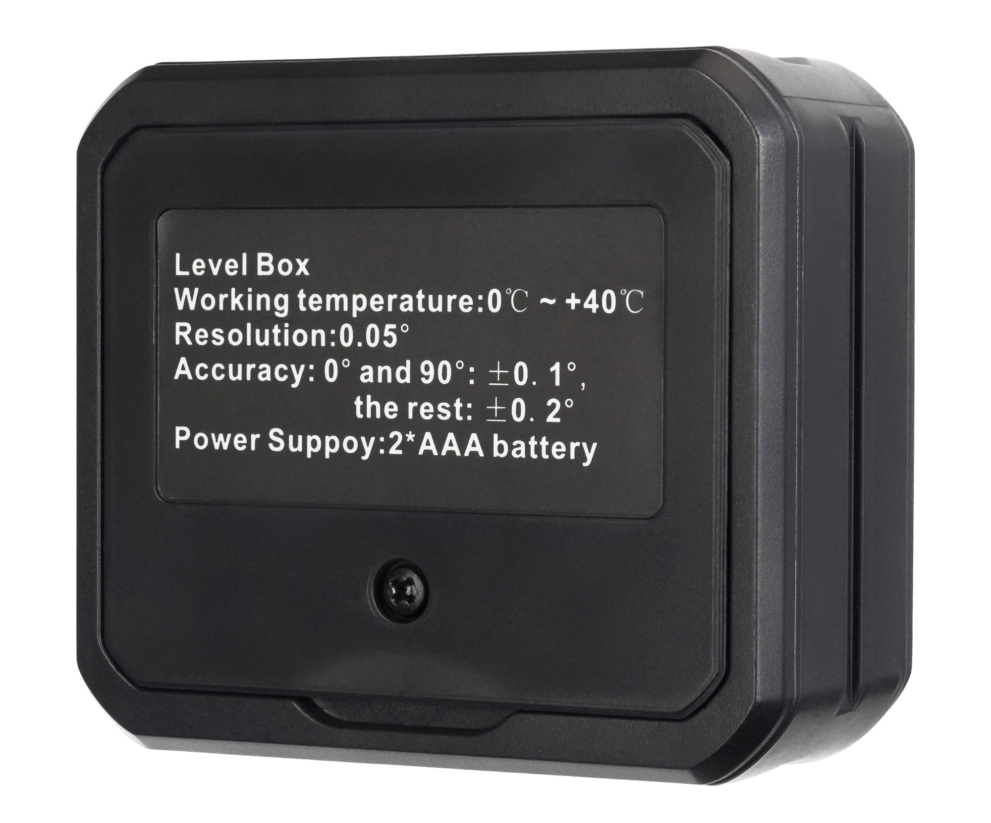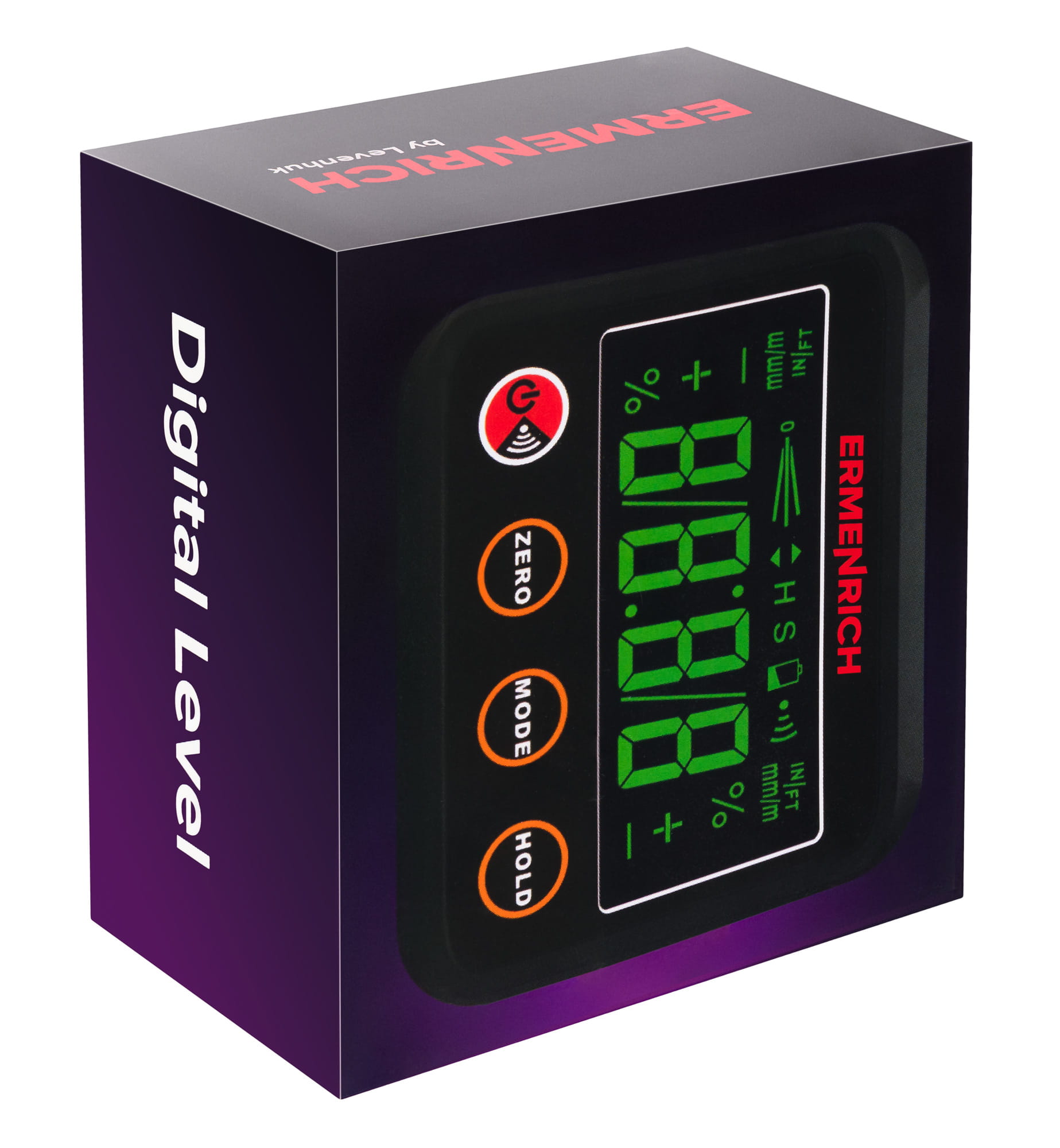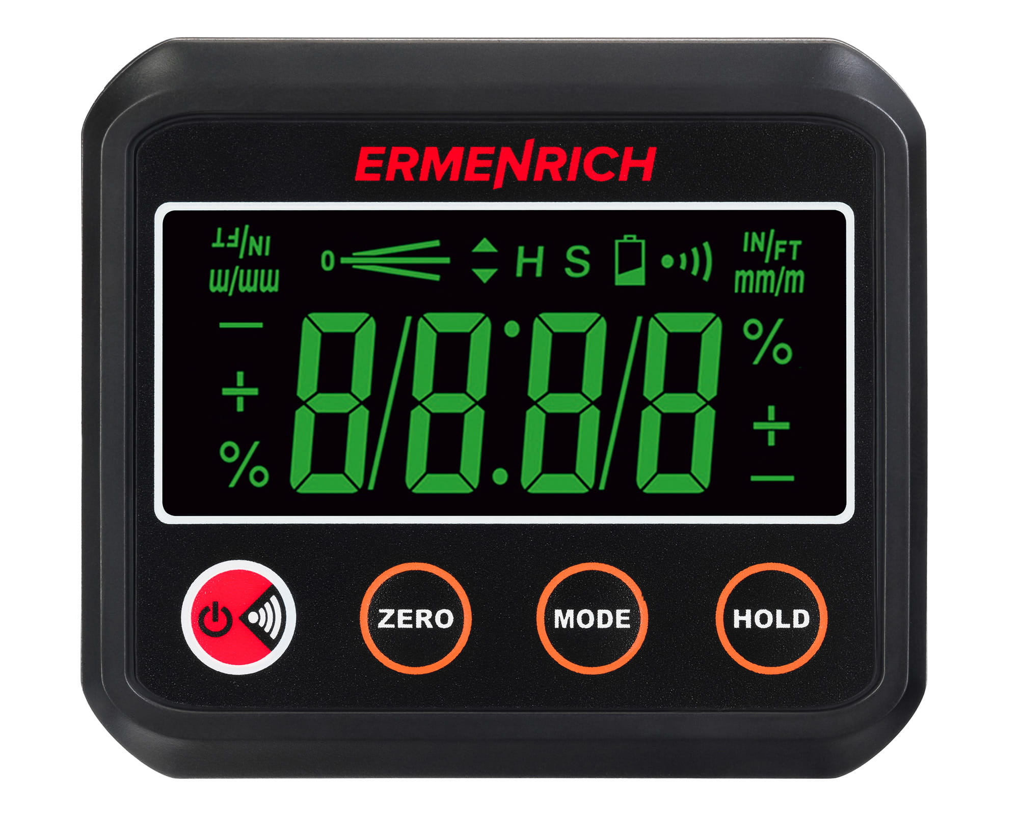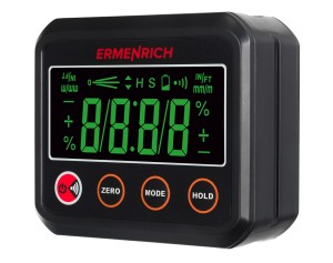 Odczyty są wyświetlane na wbudowanym wyświetlaczu LCD, a przyciski sterowania są umieszczone poniżej. Poziomica cyfrowa Ermenrich Verk LQ40 jest wyposażona w dodatkowe funkcje, które ułatwiają pracę – istnieje możliwość „zamrożenia” odczytów i ustawienie urządzenia na wartość zero, aby mierzyć kąty względne. Podstawa magnetyczna V-Groove ułatwia bezpieczne umieszczenie urządzenia na metalowej powierzchni. Korpus z wytrzymałego tworzywa ABS i poliwęglanu jest odporny na wstrząsy i zabezpieczony przed spadającymi kroplami wody. Urządzenie jest zasilane standardowymi bateriami AAA i jest wyposażone w funkcję automatycznego wyłączania, która powoduje wyłączenie poziomicy po 3 minutach bezczynności.