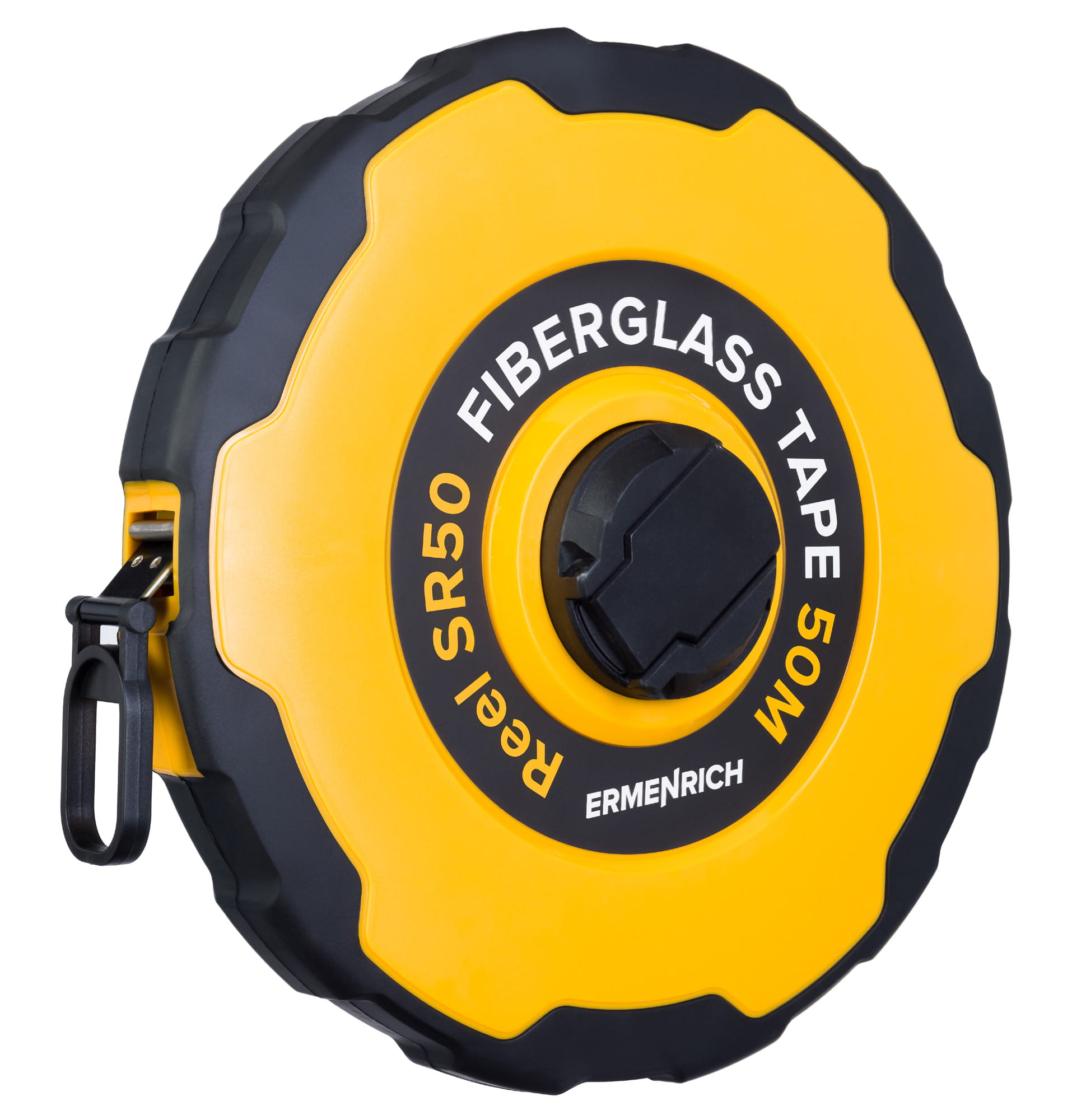 Taśma miernicza Ermenrich Reel SR50 może mierzyć do 50 metrów. Jest to taśma z włókna szklanego z podwójną skalą w solidnej obudowie tarczowej z tworzywa sztucznego ABS. Taśma wyposażona jest w duży i łatwy w użyciu hak na końcu. Do zwijania taśmy służy rączka szpuli. Można ją złożyć, gdy nie jest potrzebna.