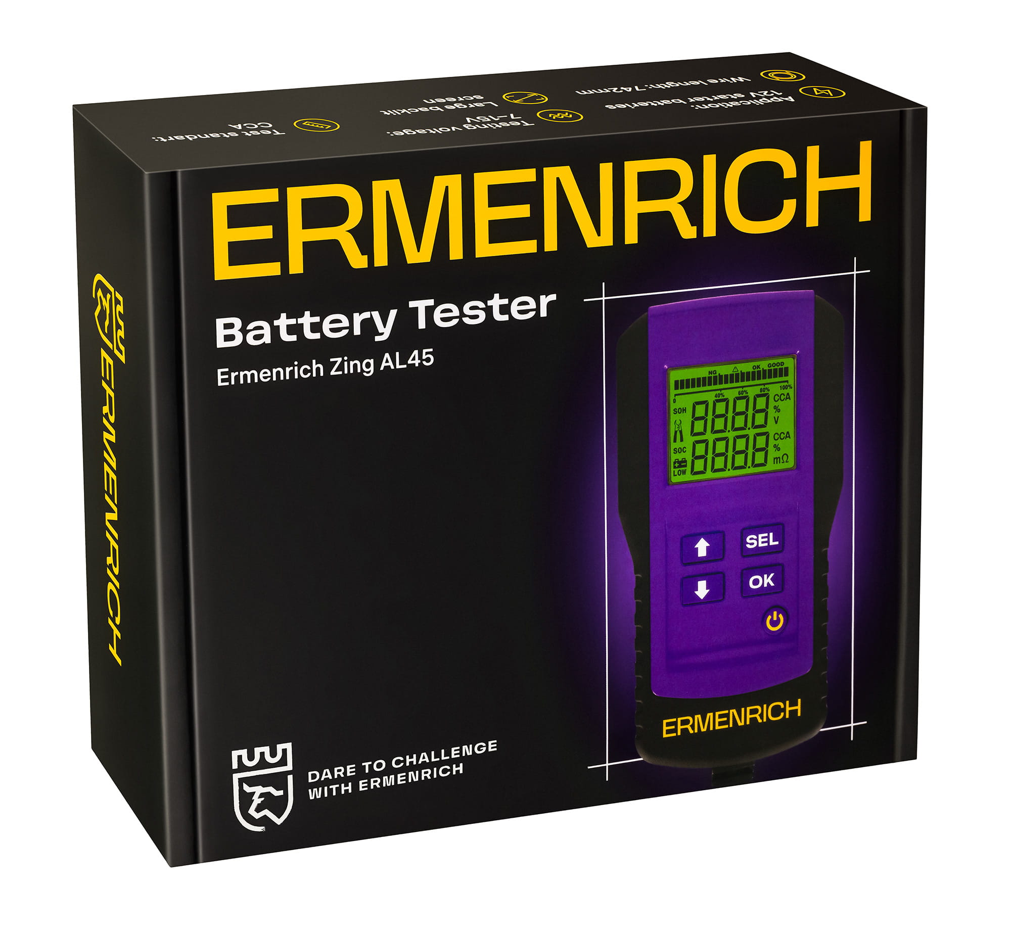 Tester akumulatorów Ermenrich Zing AL45 to intuicyjne narzędzie, które umożliwia szybkie sprawdzenie stanu akumulatora samochodowego lub nieprzerwanego zasilania (UPS). Tester łączy się z anodą i katodą za pomocą dwóch terminali. W ten sam sposób tester jest ładowany – nie jest wymagane inne źródło zasilania.