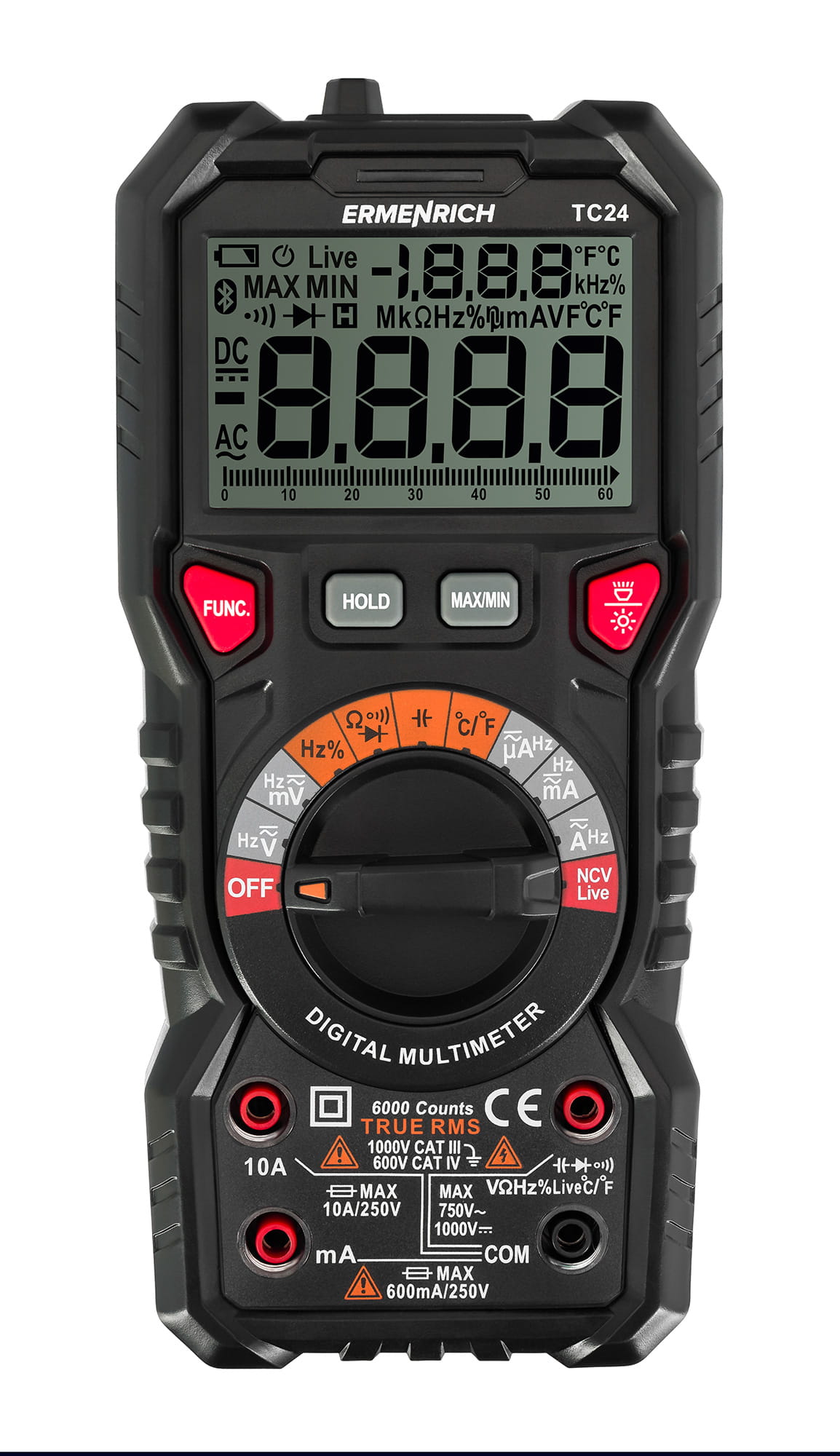 Uniwersalny miernik cyfrowy Ermenrich Zing TC24 to profesjonalne urządzenie do testowania sieci i urządzeń elektrycznych oraz pomiaru takich parametrów jak rezystancja, napięcie, natężenie prądu, cykl pracy, częstotliwość, pojemność elektryczna i temperatura. Obliczenia True RMS gwarantują wysoką dokładność pomiaru. Automatyczny wybór limitu ułatwia korzystanie z urządzenia. Uniwersalny miernik to niewielkie i niezawodne narzędzie zasilane standardowymi bateriami.