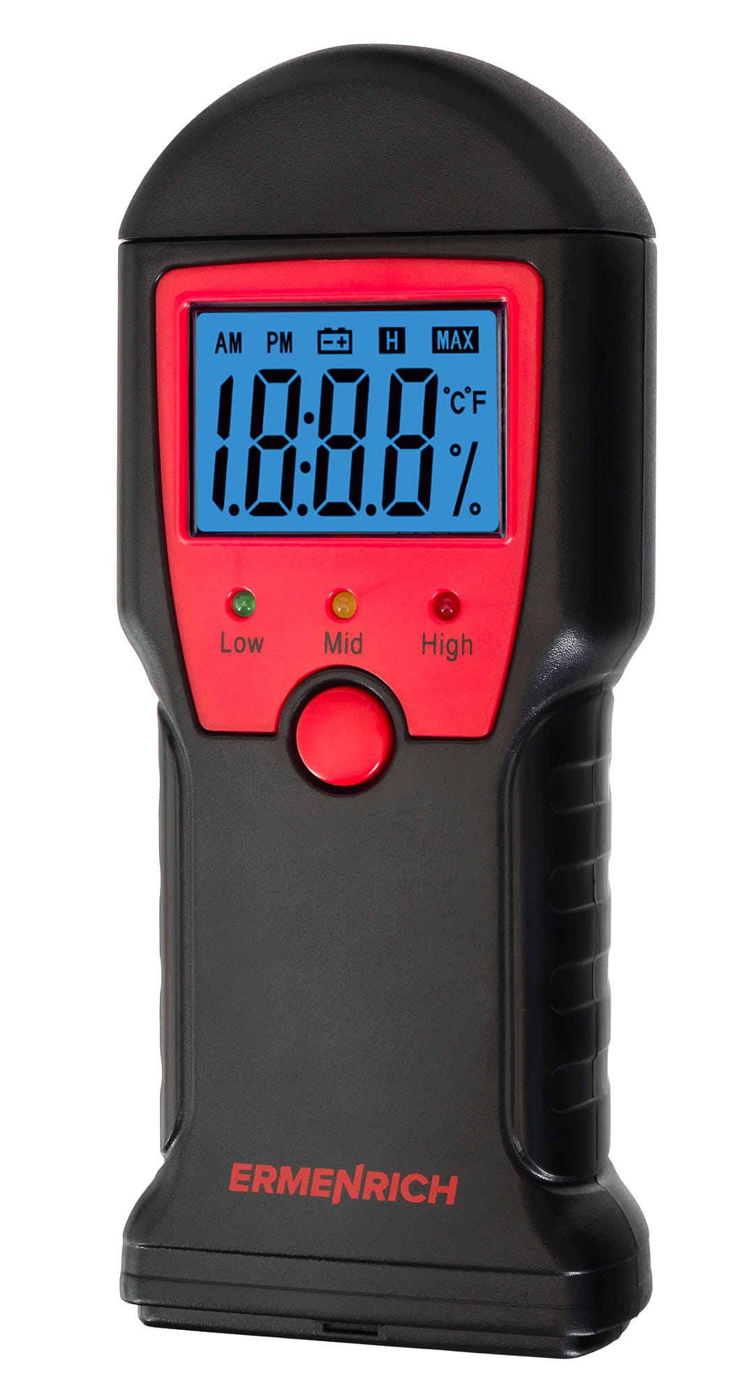 Ermenrich Wett MW10 to wilgotnościomierz oporowy służący do mierzenia wilgotności drewna, mieszanek budowlanych i zapraw murarskich. Urządzenie może również mierzyć temperaturę w stopniach Celsjusza i Fahrenheita. Proste sterowanie jednym przyciskiem. Wartości pomiarów są wyświetlane na wbudowanym ekranie w postaci dużych cyfr na jasnoniebieskim podświetleniu. Pod ekranem umieszczono trzy wskaźniki LED, które informują o ogólnej ocenie wilgotności materiału: zielony oznacza niski poziom wilgotności, żółty to poziom podwyższony, a czerwony oznacza poziom wysoki.