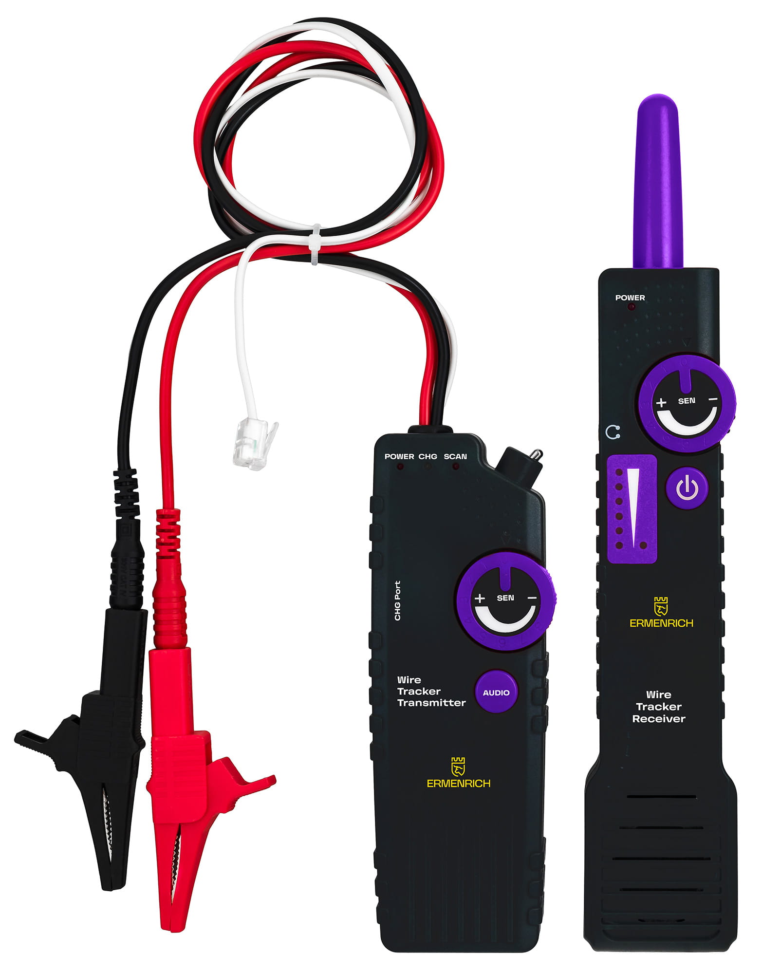 Urządzenie obejmuje nadajnik i odbiornik, których czułość można regulować oddzielnie. Obydwa urządzenia są zasilane wbudowanymi akumulatorami. Zestaw zawiera przewód ładowania. Wykrywacz przewodów Ermenrich Ping SM100 jest dostępny ze słuchawkami, które sprawdzają się podczas pracy w głośnym środowisku.