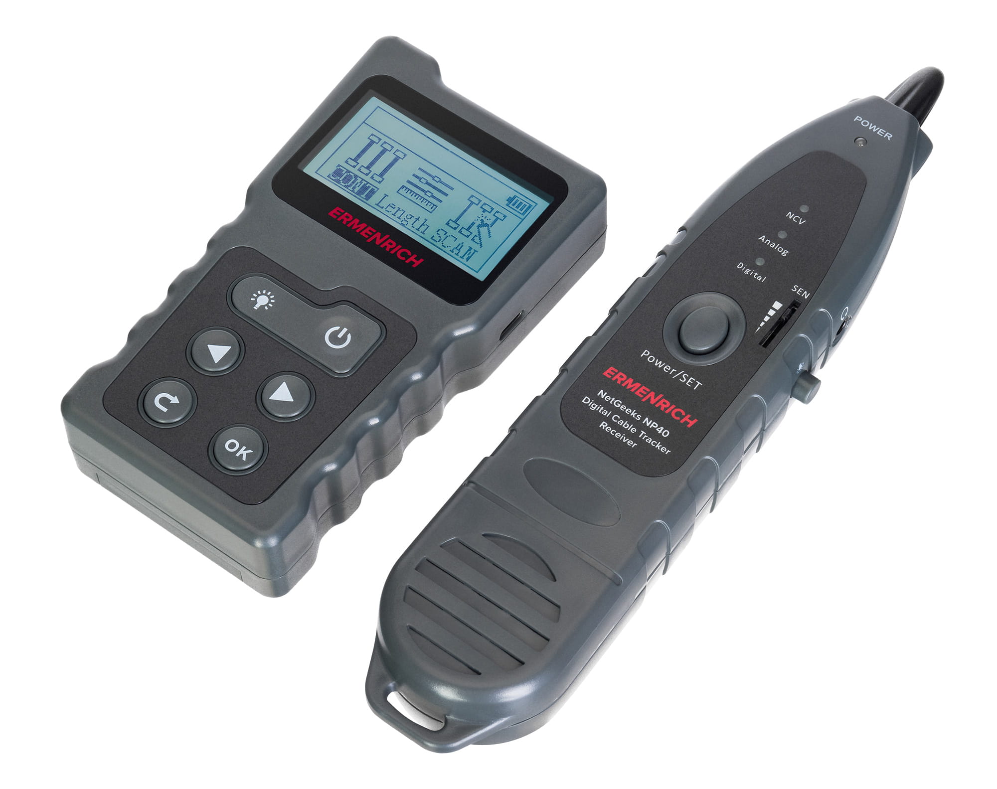 Ermenrich NetGeeks NP40 to wielofunkcyjny tester przewodów cyfrowych opracowany na potrzeby wykrywania przewodów skręcanych parami i telefonii, testowania przewodów w zakresie usterek i błędów instalacji, mierzenia długości przewodów oraz odległości do przerw i zwarć w obwodach. Urządzenie jest doskonałym narzędziem dla techników instalujących i konserwujących sieci komputerowe oraz linie telefoniczne w biurach, budynkach i domach.