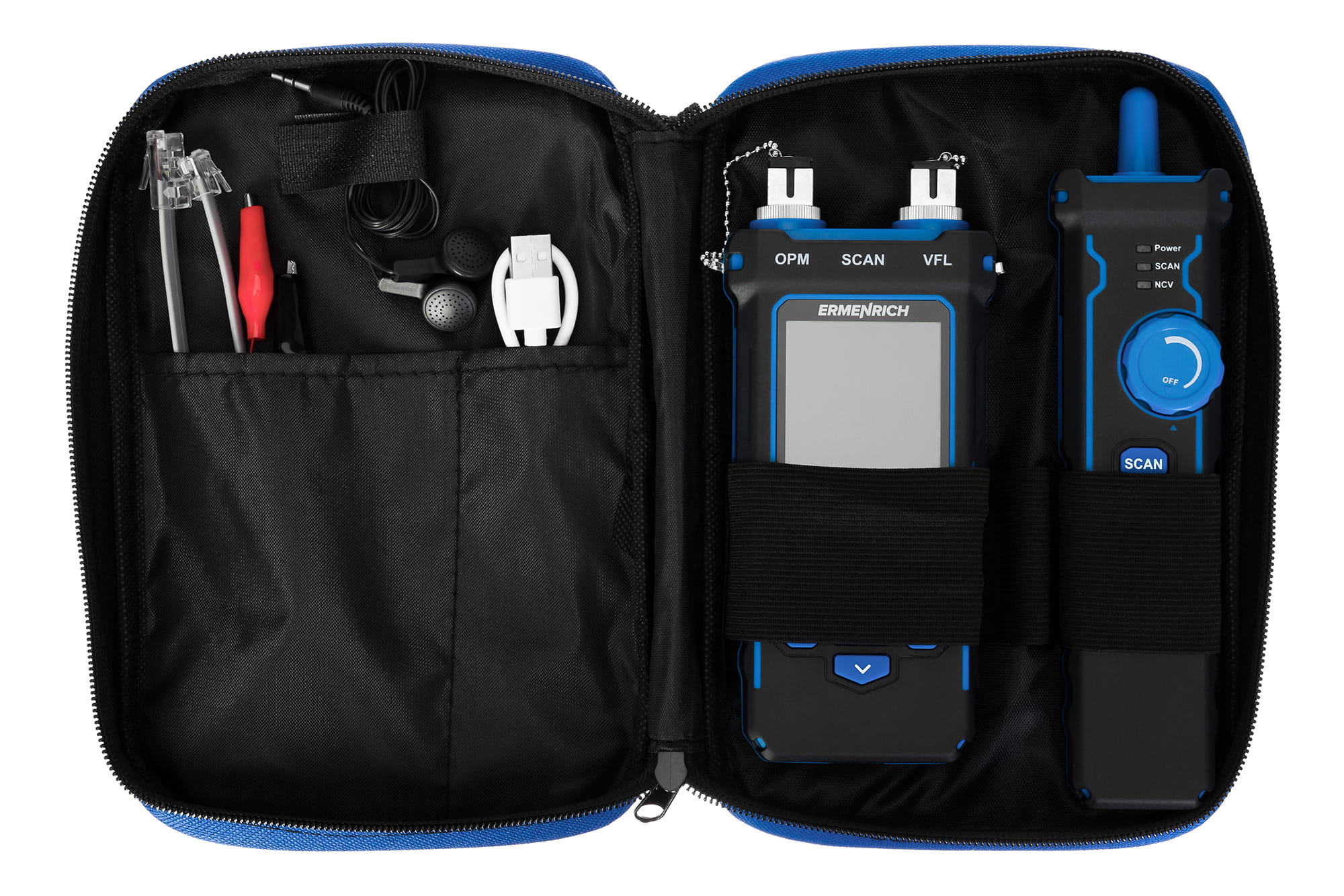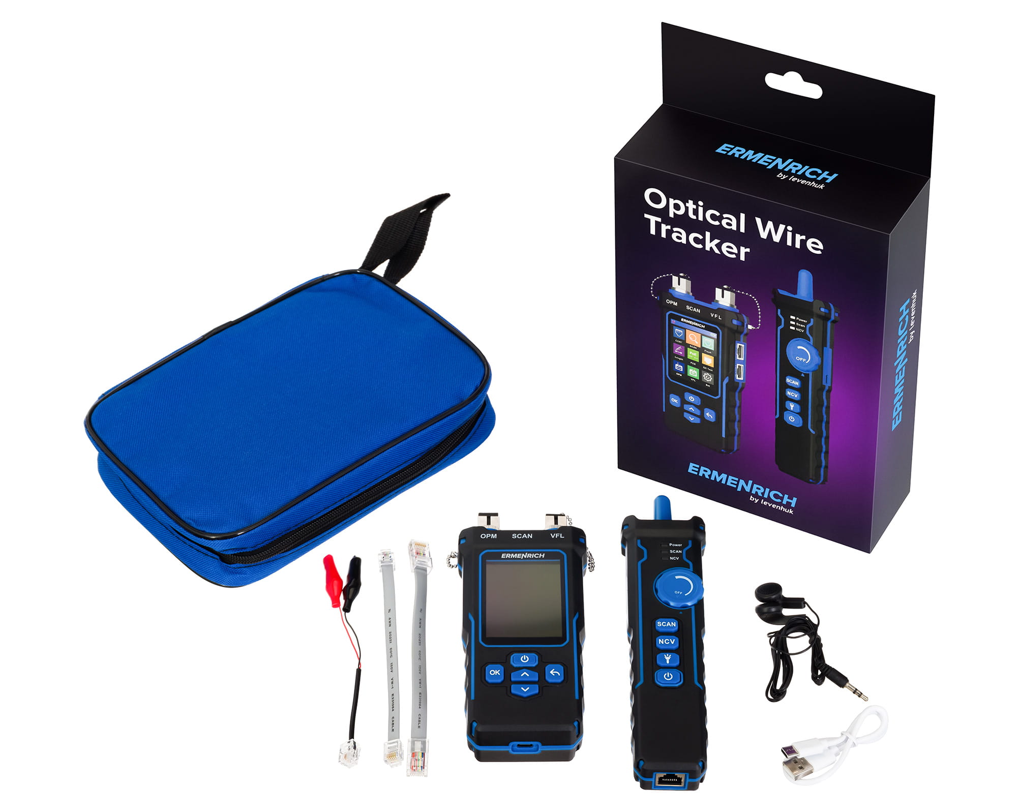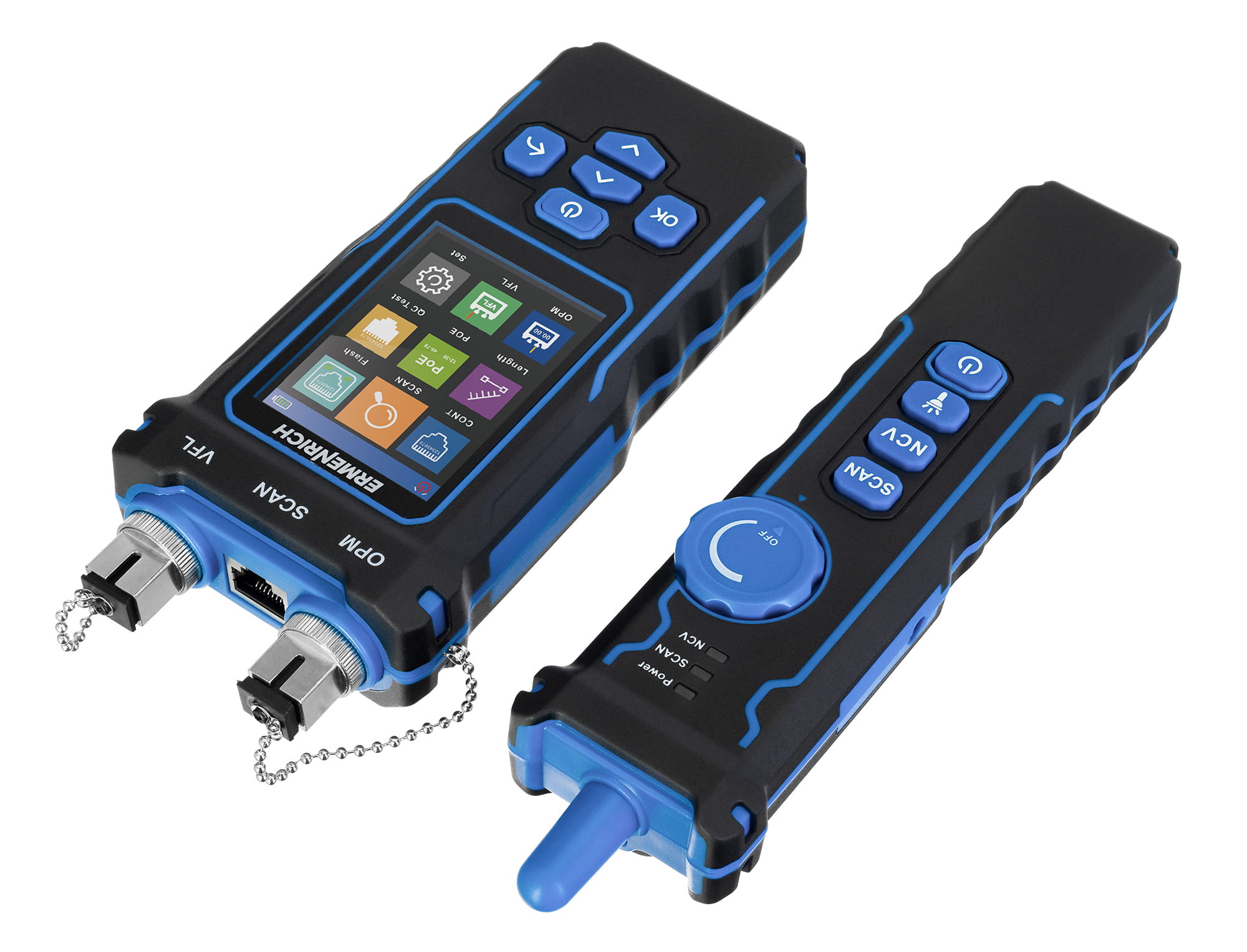 - 3-w-1: tester przewodów, tester mocy optycznej, miernik długości przewodów